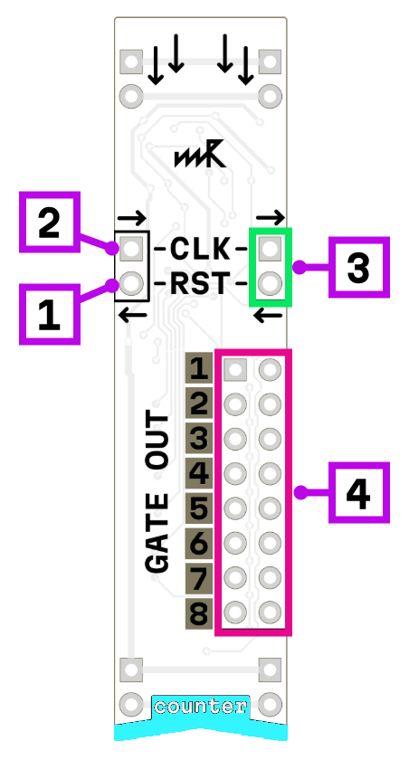 Counts from 1 to 8 and then restarts from the beginning. It advances on each trigger or gate received at the clock input. The reset input resets the counter back to step 1.