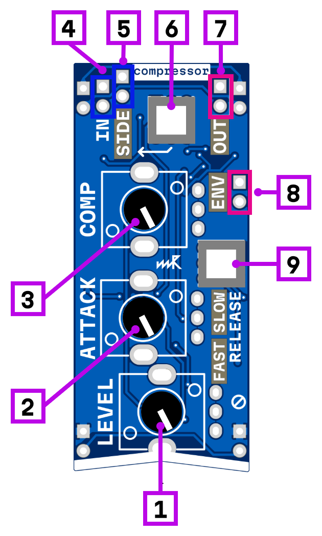 The attack [2] knob adjusts how quickly the compressor responds to transients. The release mode [9] button toggles between fast and slow release times. The output level [1] knob allows you to compensate for gain reduction.