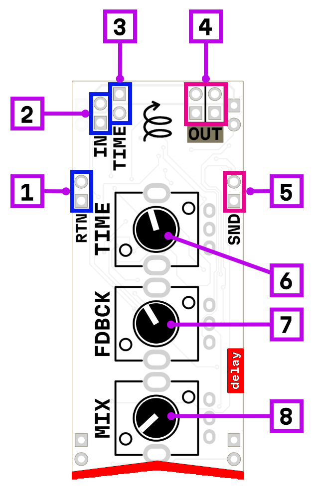 The delay time can be modulated via the CV input, allowing for vibrato, or more experimental pitch-shifting textures.