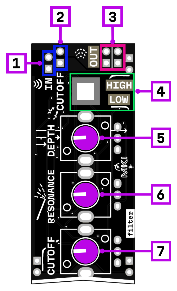 filter¶ signal input cutoff modulation input signal output highpass/lowpass mode switch CV modulation depth (attenuverter) resonance control cutoff frequency control Power consumption¶ 540 mW